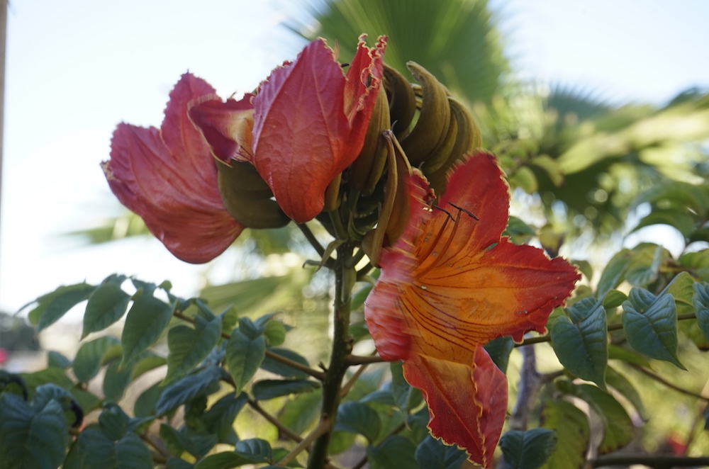 The African tulip tree is one of the most beautiful flowering trees in the world. Native to tropical Africa it is the only species in its genus. The tree has clusters of large flamboyant red orange flowers that split open vertically in a trumpet shape. The open flowers are cup-shaped and hold rain and dew, making them attractive to many species of birds, while their nectar is popular with many hummingbirds. The tree blooms all year round although the flowers only last for a few days. In Africa, this tree is known for its medicinal properties: the leaves and bark decoction is used to cure rashes and inflamed skin, the bark helps to lower the levels of blood sugar, while the paste made from the bark is used for healing wounds.