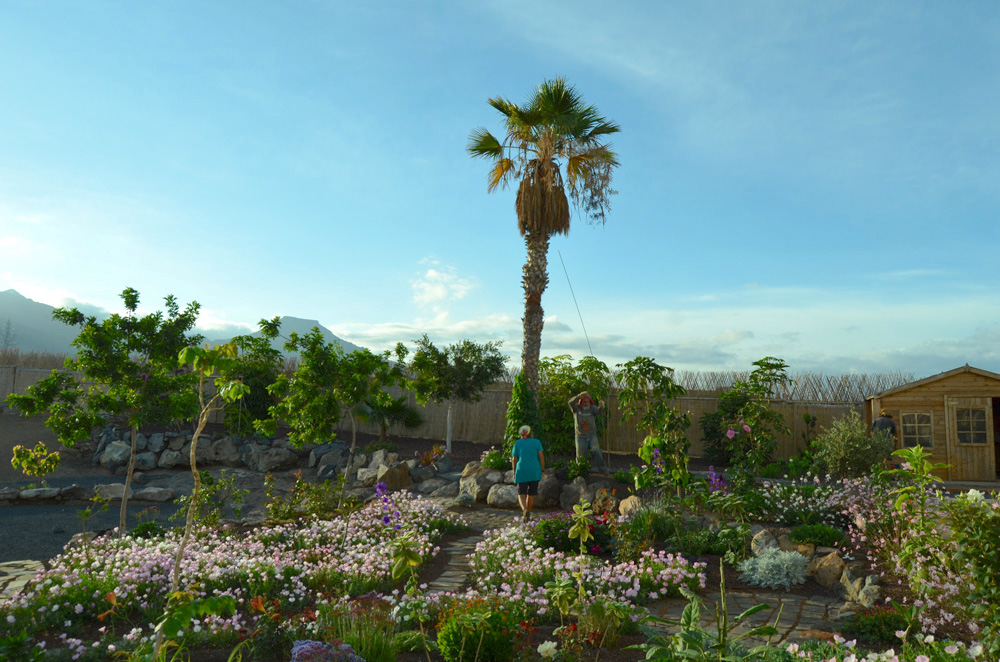 The pathways are made of bluish grey pebbles giving the impression of a flowing river or the stream of time. The sunset area with its trees, bushes, and flowers blooming in different shades of yellow, orange, red, and pink, quickly gives way to that of the night with its white and silver flowers that reflect the moon and its deep purple-blue and purple-red flowers that reflect the sky. In full moon periods the garden is magical and silvery with a host of pale pink evening primroses dancing in the wind!